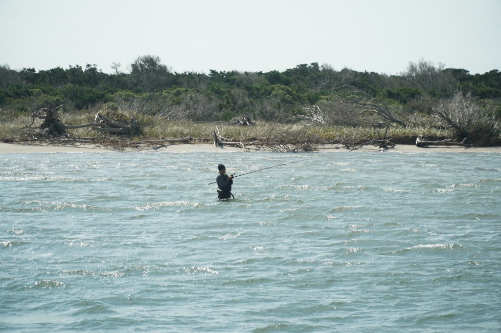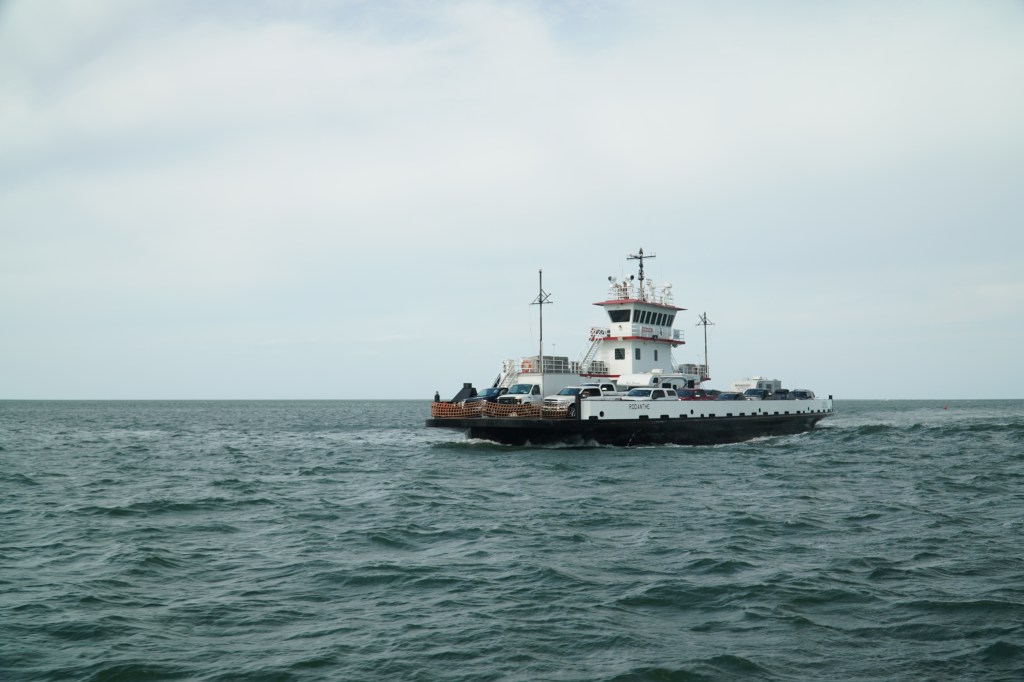 As the ferry powers us out into the Pamlico Sound, I see fishermen wading in the sound with massive poles, probably after red drum or other fish, as pelicans fly over the water and a friendly dog pokes his head out the truck that’s parked in front of me. The crossing takes you in a wide U around the Hatteras Inlet, and a crab-spawning sanctuary between the islands of Hatteras and Ocracoke. On the way over, you get to watch a fair amount of seabirds and are subjected to the very loud engine of the ferry and its lovely smell of diesel.