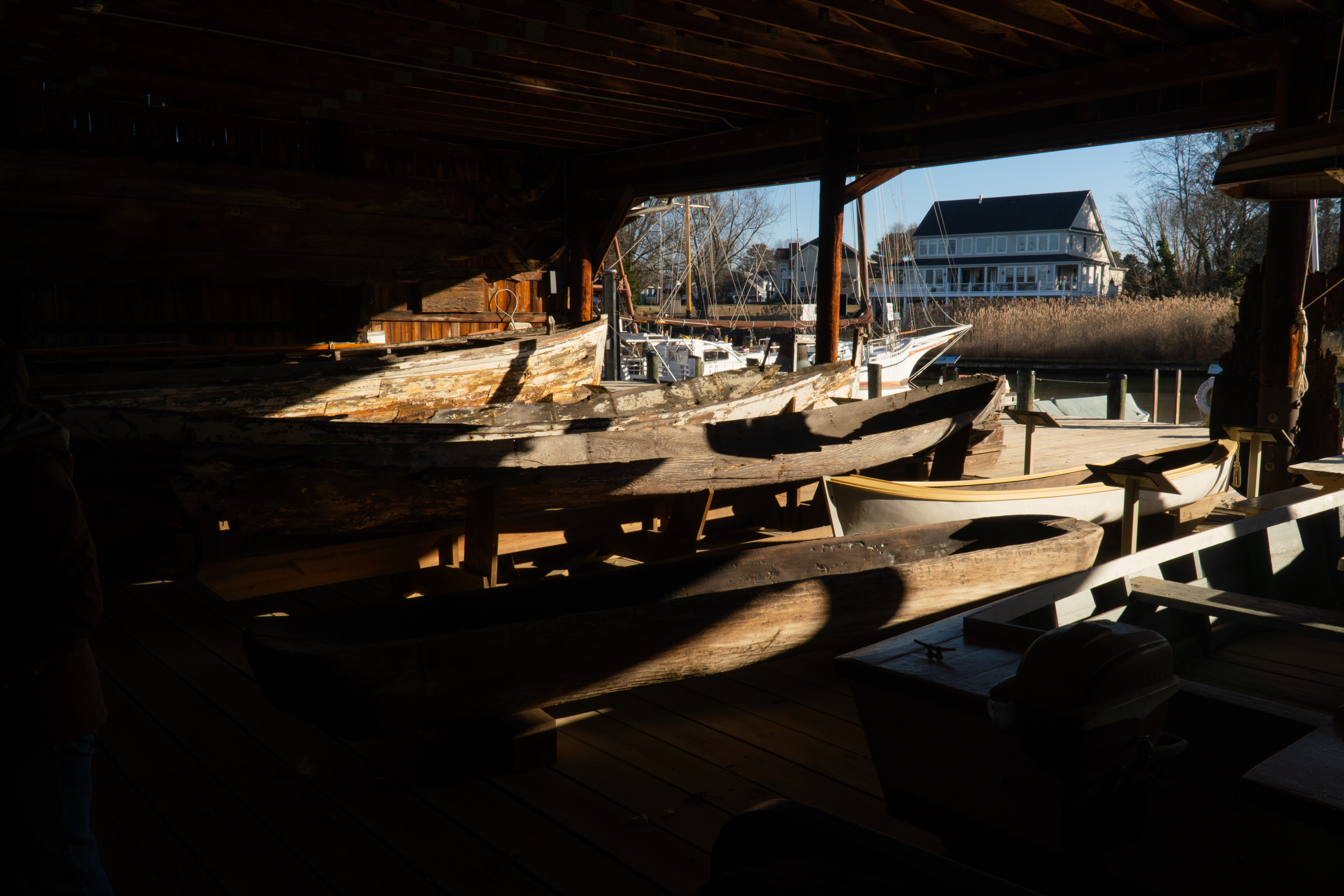 The screwpile light station had originally been built in 1883 and photos from around the time show the stilts in the waters of the Chesapeake at the mouth of the Patuxent River. After it was decommissioned in 1962, it was vandalized, but in 1975 was moved to the Calvert Marine Museum, a local repository of Chesapeake shipping and boating knowledge. The lighthouse abuts a large shelter full of various kinds of small craft, from a traditional dugout canoe to flat-bottomed crabbing boats.