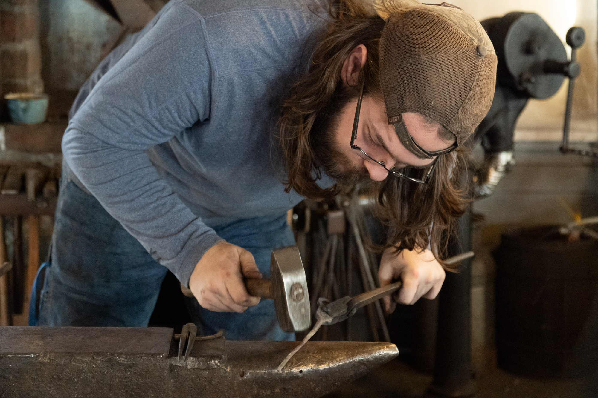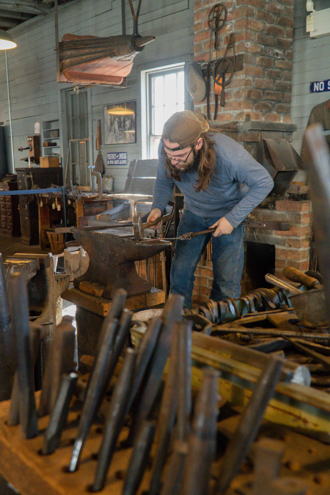The museum has a blacksmithing area that still operates and hosts a club of enthusiasts for keeping the old trade alive. Tyler Gehringer, a college student who was back home for a break, was there that day, working on making a corkscrew from a piece of iron. He told me that he got into this community when he visited the museum with his parents and was intrigued by the men working in the shop. He came back again another weekend, and they taught him to stoke the fire, just one menial task. The next time he came back, they taught him something else—how to hammer round stock into square iron stock. The time after that, another slightly more advanced skill—how to hammer square stock into round stock. After that, the guys in the shop realized that he wasn’t going to just go away, so they gave him a test of initiation as a ticket to use the shop unsupervised: turn a piece of metal into a knot, using only the hammer and anvil, no tongs or other special tools. If he could manage that, the shop was his to use independently.