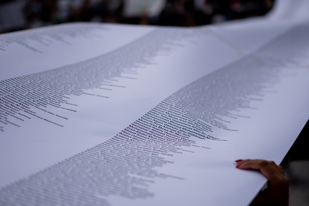 Through a section of the crowd, a group was holding a long, printed roll of paper, with line after line of 8,000 names of individuals killed in Gaza in the last month.